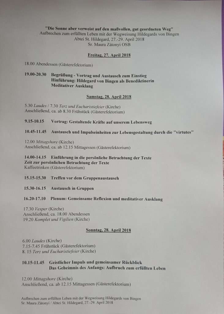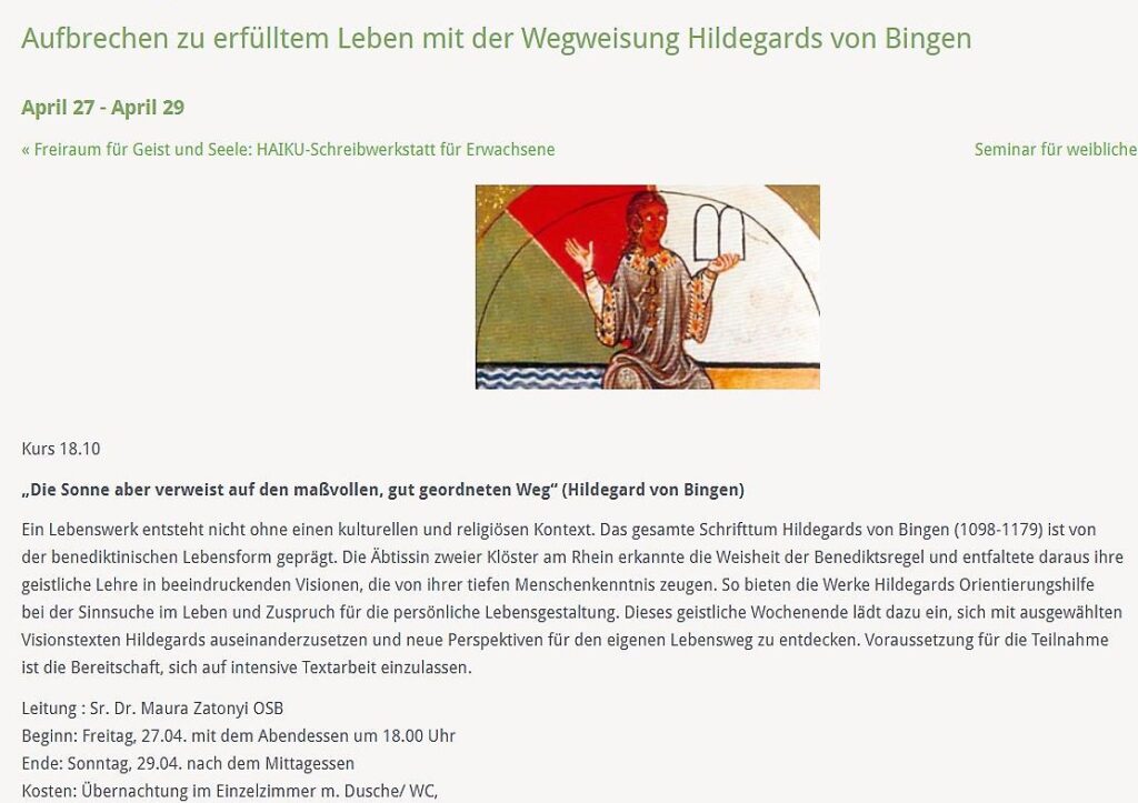 Von Sr. Maura Zátonyi hatte ich einige Artikel gelesen, die ich sehr inspirierend fand. Dann stellte ich fest, dass sie in der Abtei St. Hildegard lebt und dort ein Seminar anbietet. Nach einigem Hin und Her, beschloss ich daran teilzunehmen.
