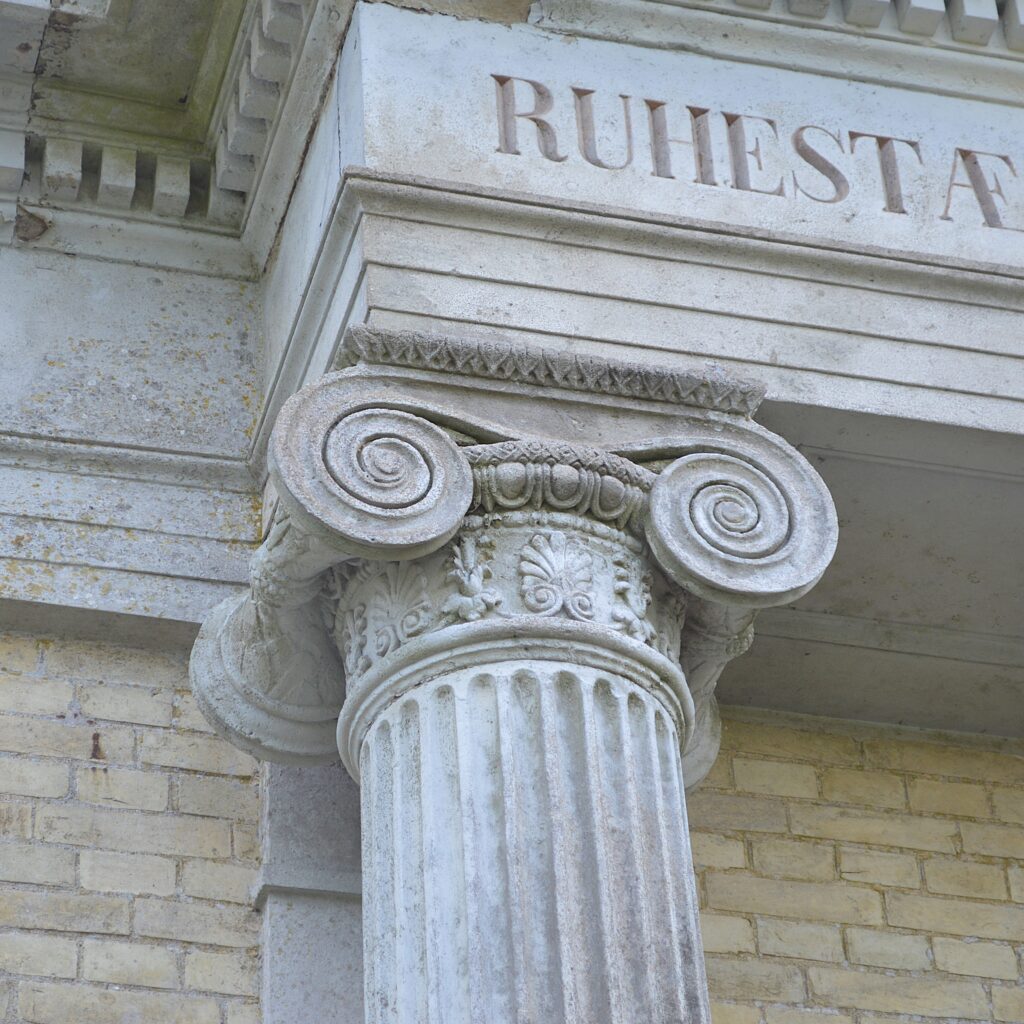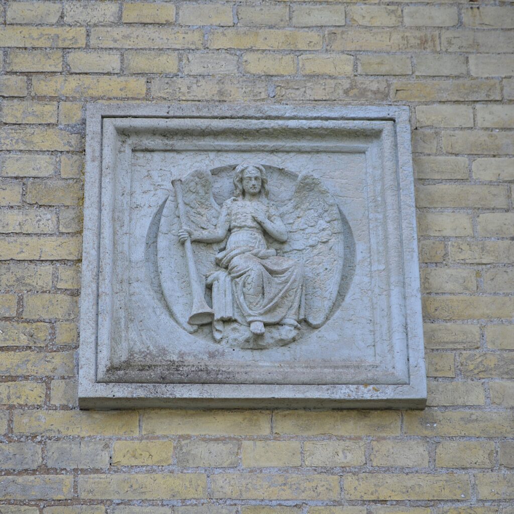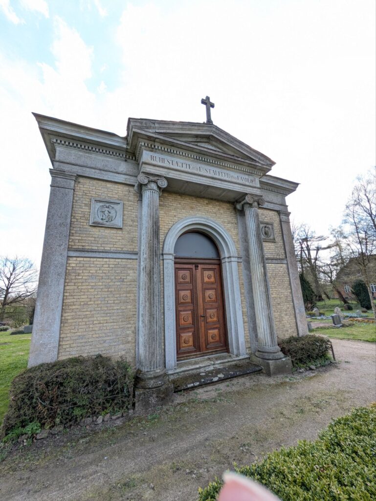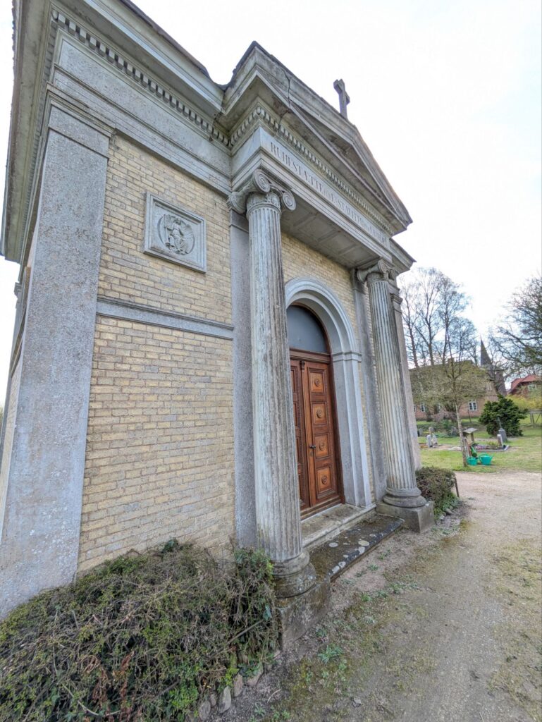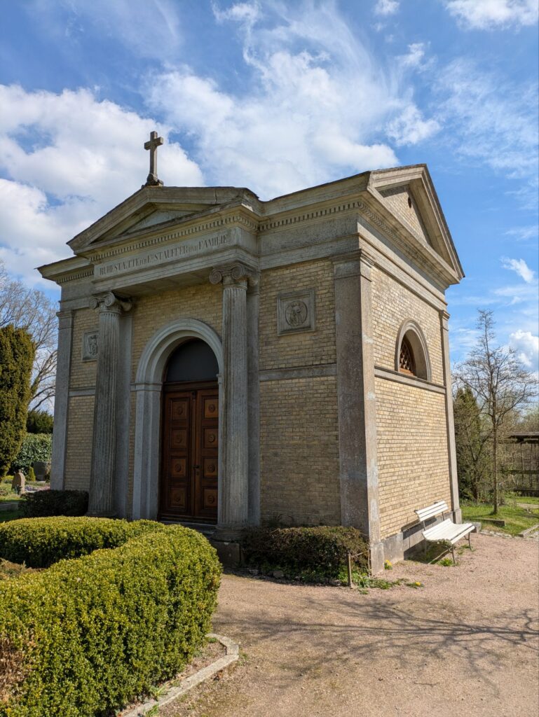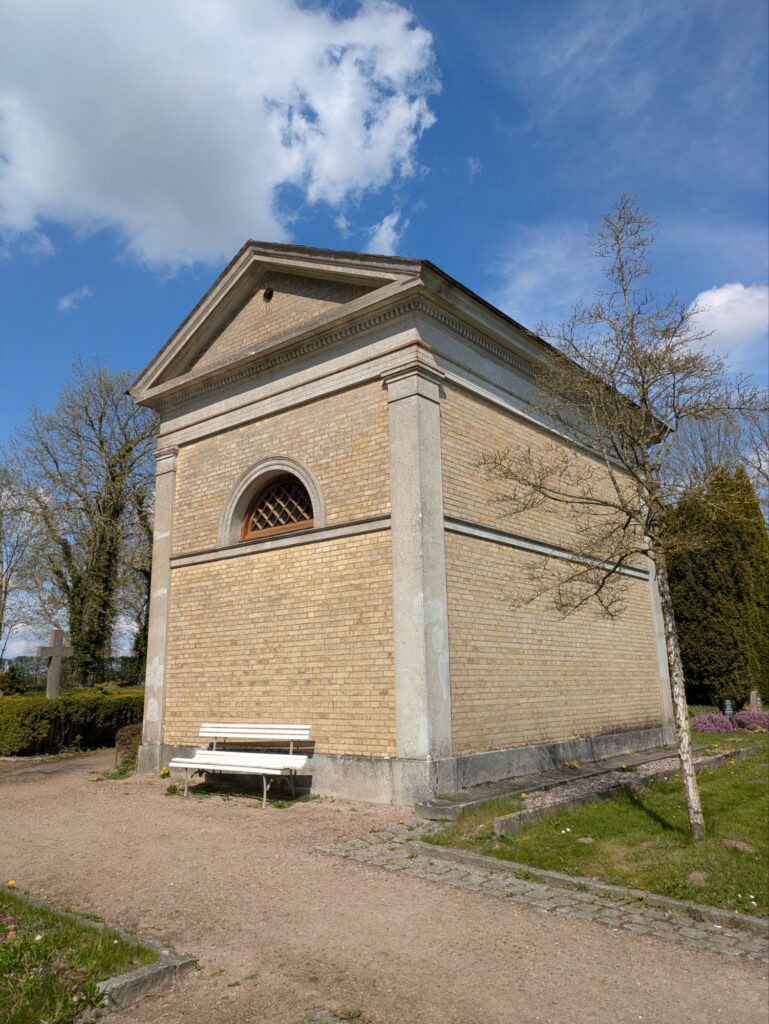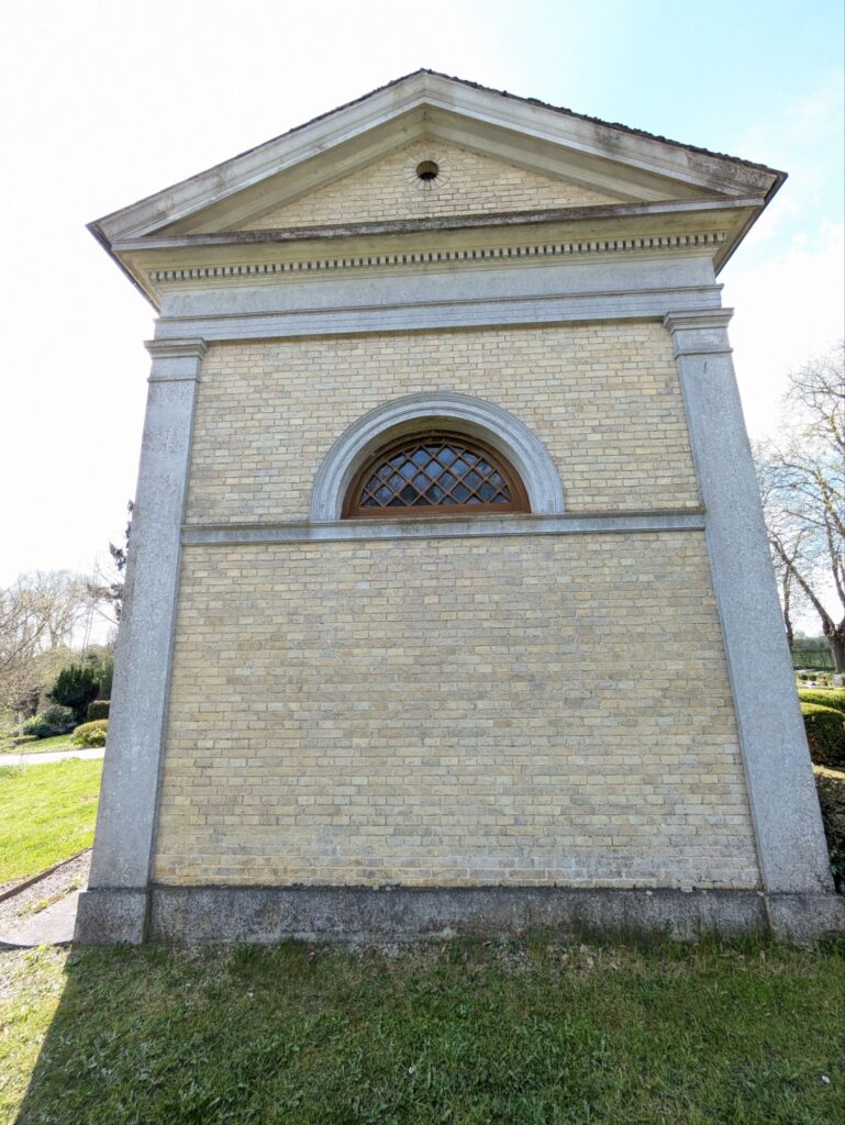 19. Jh.; kleiner eingeschossiger Rechteckbau aus gelbem Backstein in spätklassizistischen Formen, Eckpilaster und Architekturglieder aus Sandstein und Putz, an nordwestlicher Längsseite flacher Säulenportikus mit rundbogigem Eingang