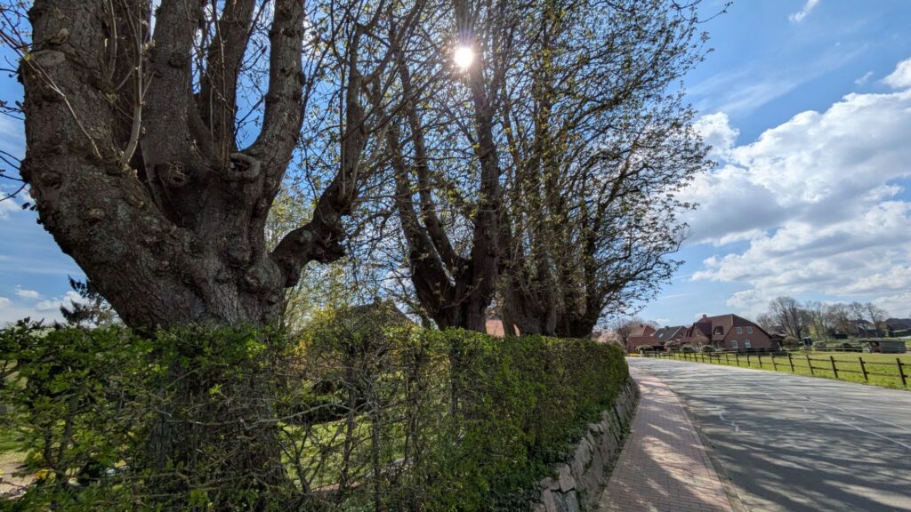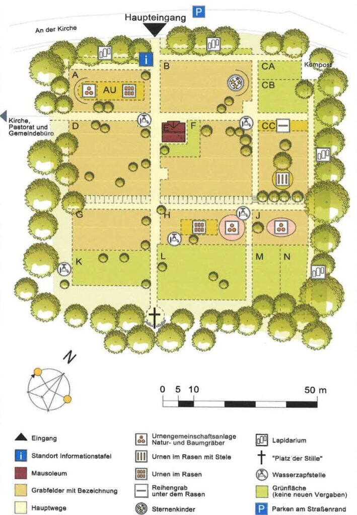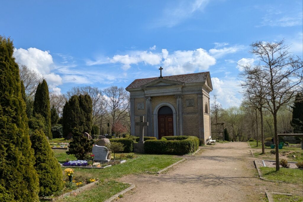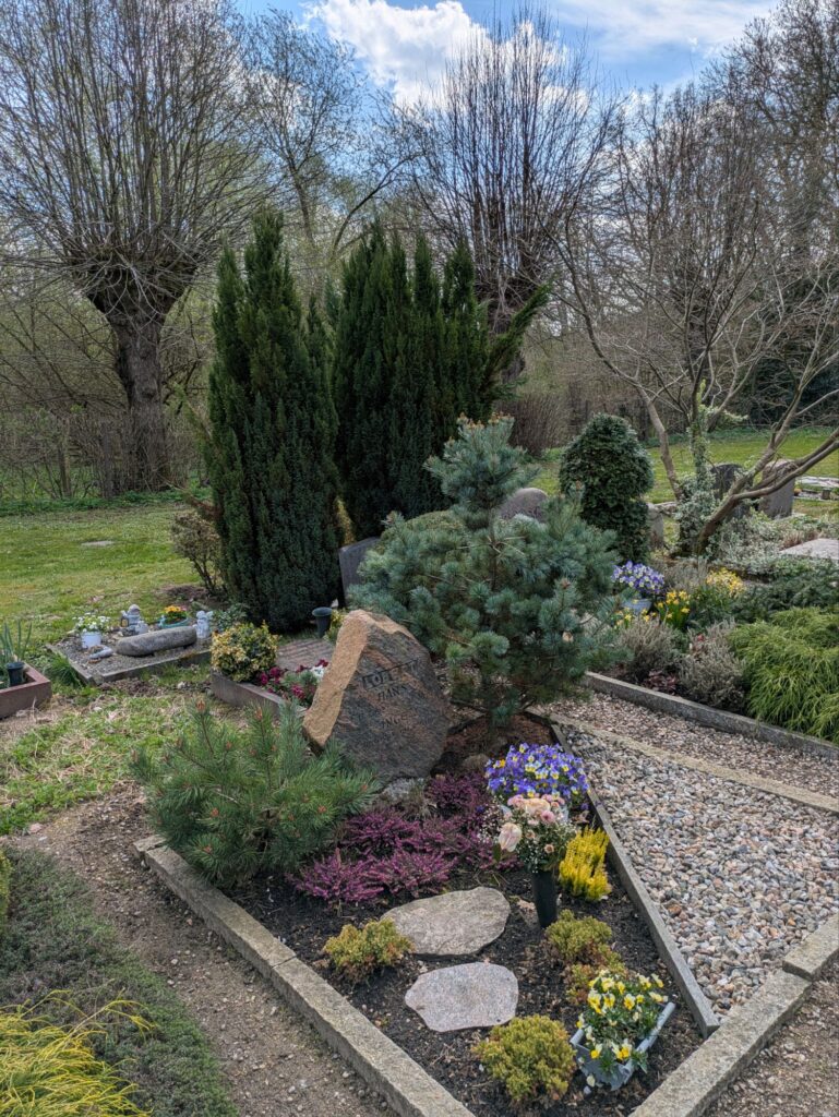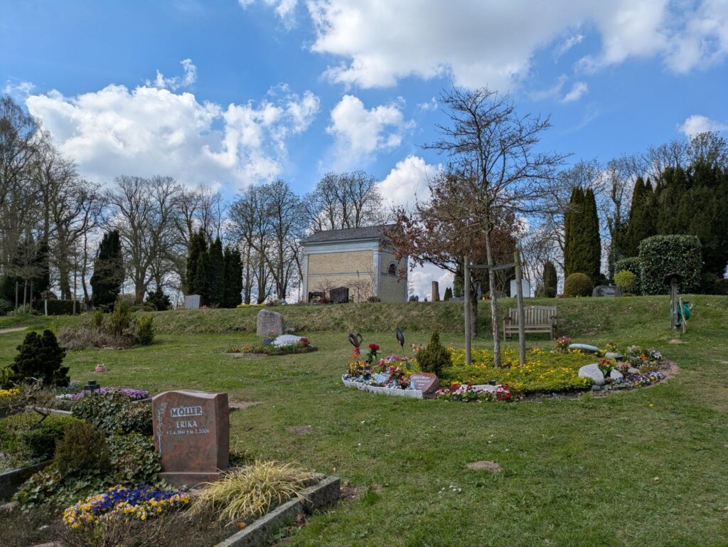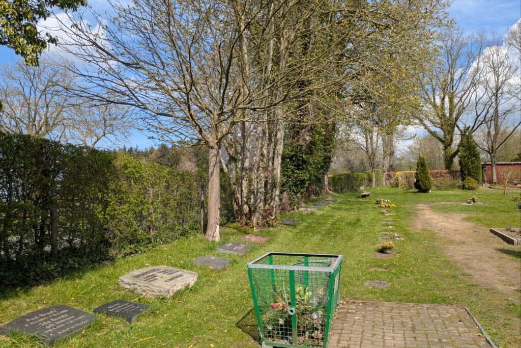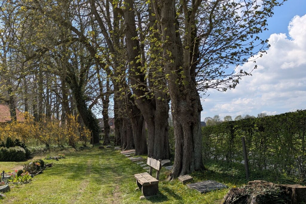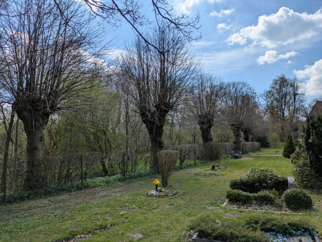 Die Bäume rings um den Friedhof sind schon älter – vielleicht wirkt der Ort etwas heimeliger, wenn sie belaubt sind.