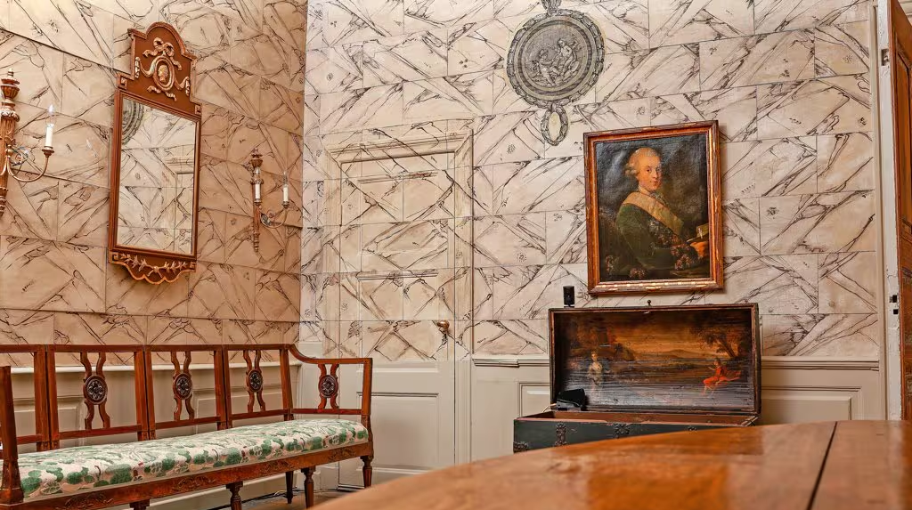 In Kopenhagen fand Nicolaus Graf zu Reventlow dieses Bild von Friedrich Wilhelm Conrad Holck (hinten), dem Erbauer von Gut Eckhof. Links an der Wand hängt ein „Altonaer Spiegel“. (Quelle)